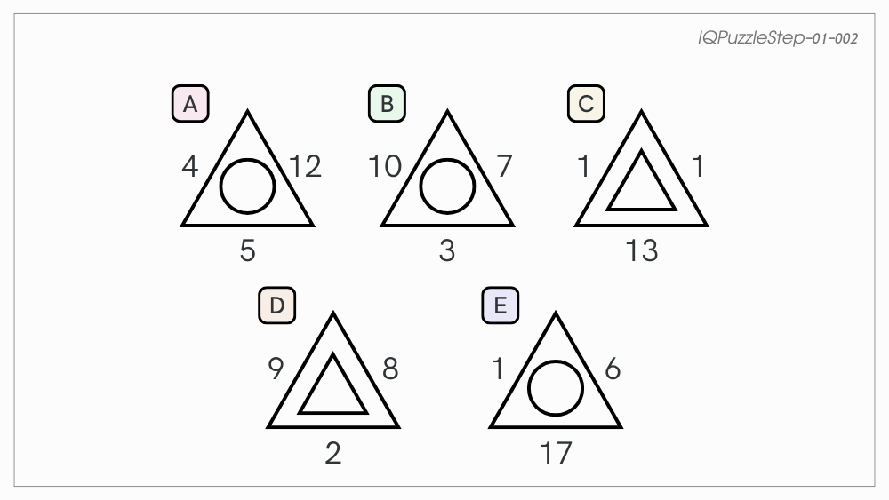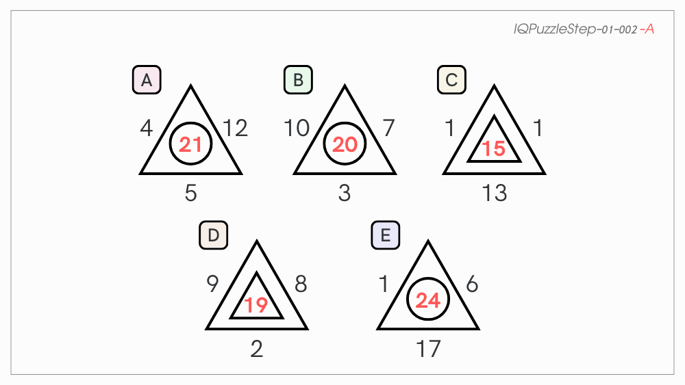 それぞれの三角形の周りの3つの数字を足して、合計が偶数なら中の図形は○、奇数なら△になります。Aだけ合計が奇数なのに○になっています。