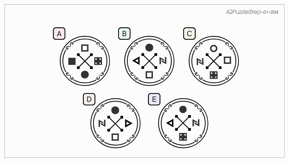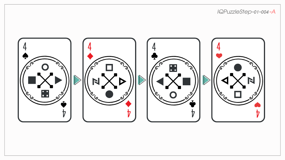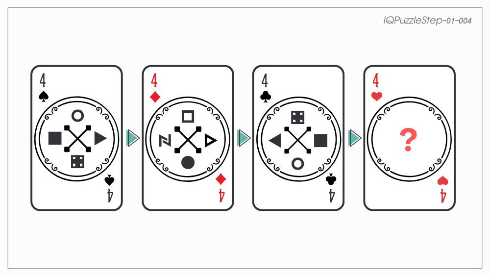 ある魔術師のトランプカードがあります。スペード → ダイヤ → クラブの順にパターンがあるとき、次のハートのカードはA~Eのどれになるでしょうか?