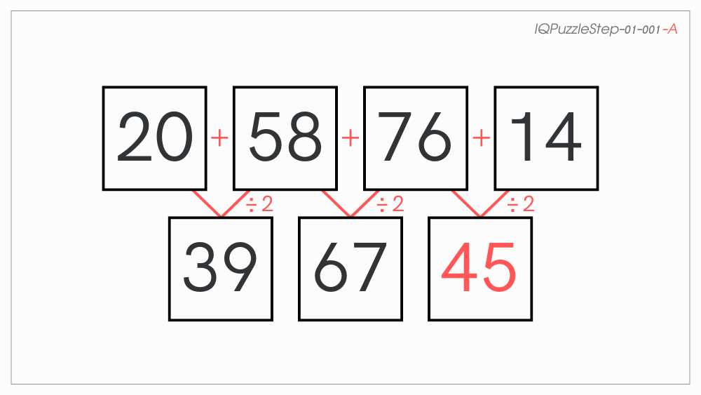 IQパズル IQパズル難易度-★★★ 【IQパズル】01-001:7番目のカード 2026年2月1日 23秒 難易度:★★★☆☆ Q.01-0017番目のカードの「?」にはどんな数字が入るでしょうか? 答え ▷01-001-答え+ 答え:45上の段の隣り合っている2つの数字を足して、それを半分にした数が下の段の数字になっています。 IQパズル