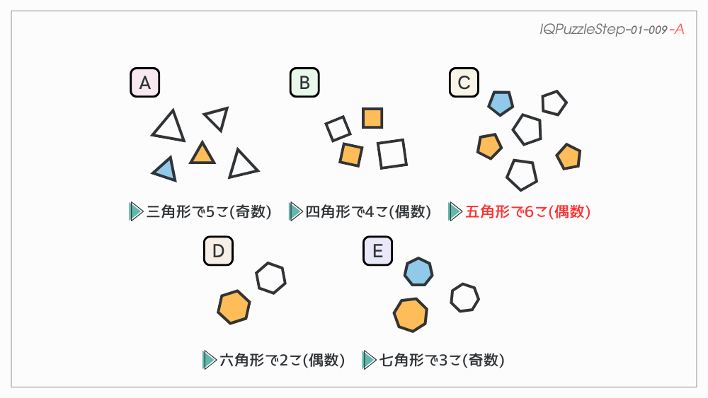 これは、奇数角形は個数が奇数、偶数角形は個数が偶数というパターンになっています。そして、C の五角形だけが「奇数角形なのに個数が偶数」であるため、仲間外れです。